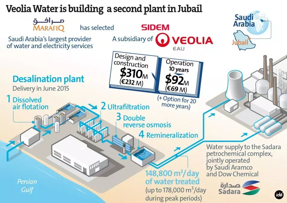 With a capacity of 178,000 cubic meters/day, the new plant is scheduled to come on stream in June 2015 and will serve the Sadara petrochemical complex built in Jubail by Dow Chemical and Saudi Aramco.