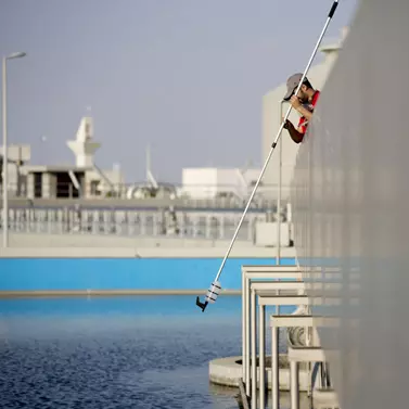 Stéphane returned to the site in 2012 for a day, to pay tribute to an outstanding achievement in pictures. «On my first visit, I was completely free to move around,” says the photographer. “This time, the plant was finished and access to the facilities was naturally more restricted.” The wastewater treatment plant had been operating for about a month. However, it offered an equally surprising spectacle to visitors. “All around, the desert had restacked its claim, with camel breeders already going about their business,” says Stéphane. “The clarifiers looked like huge pools amid the dunes, contrasting starkly with the boundless stretches of sand.”